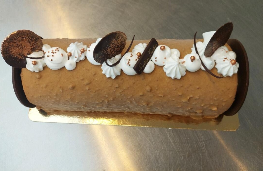 afgewerkt met een knapperig laagje chocolade Gianduja en Italiaanse merengue volgens gelegenheid Kerstmis - Nieuwjaar